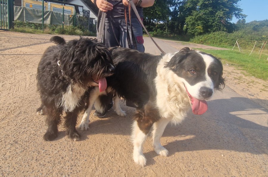 Beim Autofahren und beim Gassi zeigen beide Neugierde und Offenheit gegenüber Menschen und lassen sich problemlos anfassen.